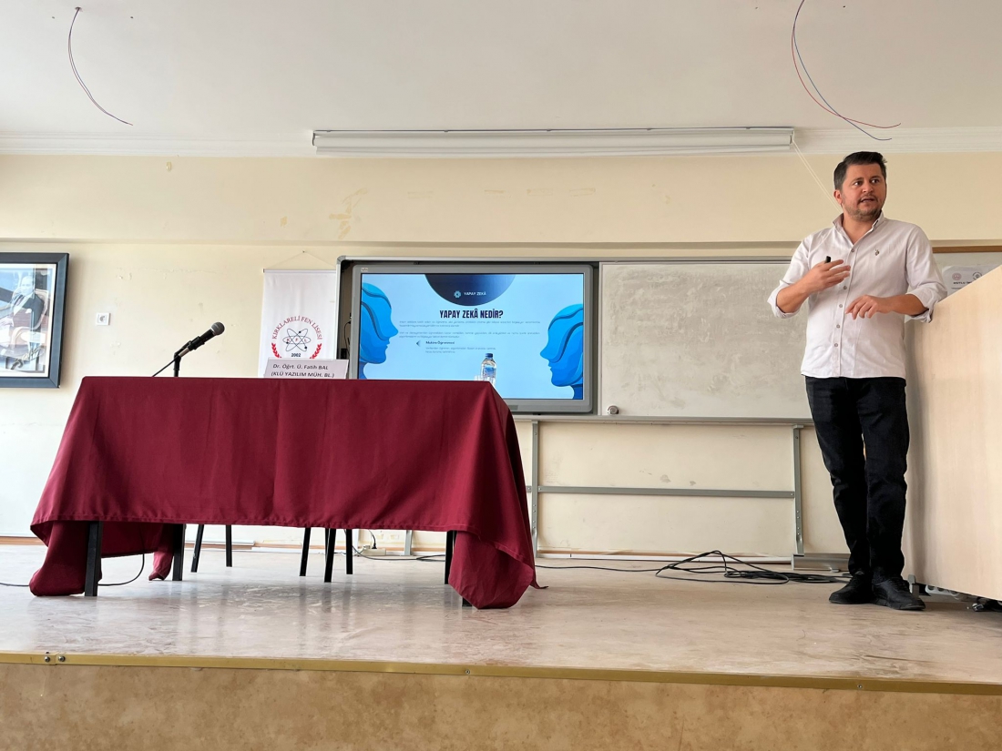 Etkinlik kapsamında Dr. Öğr. Üyesi Fatih Bal, gerçekleştirdiği "Yapay Zeka Nedir?" başlıklı sunumunda; yapay zekanın temel kavramları, makine öğrenmesi ve güncel yazılım teknolojileri hakkında öğrencilere teknik bilgiler aktardı.