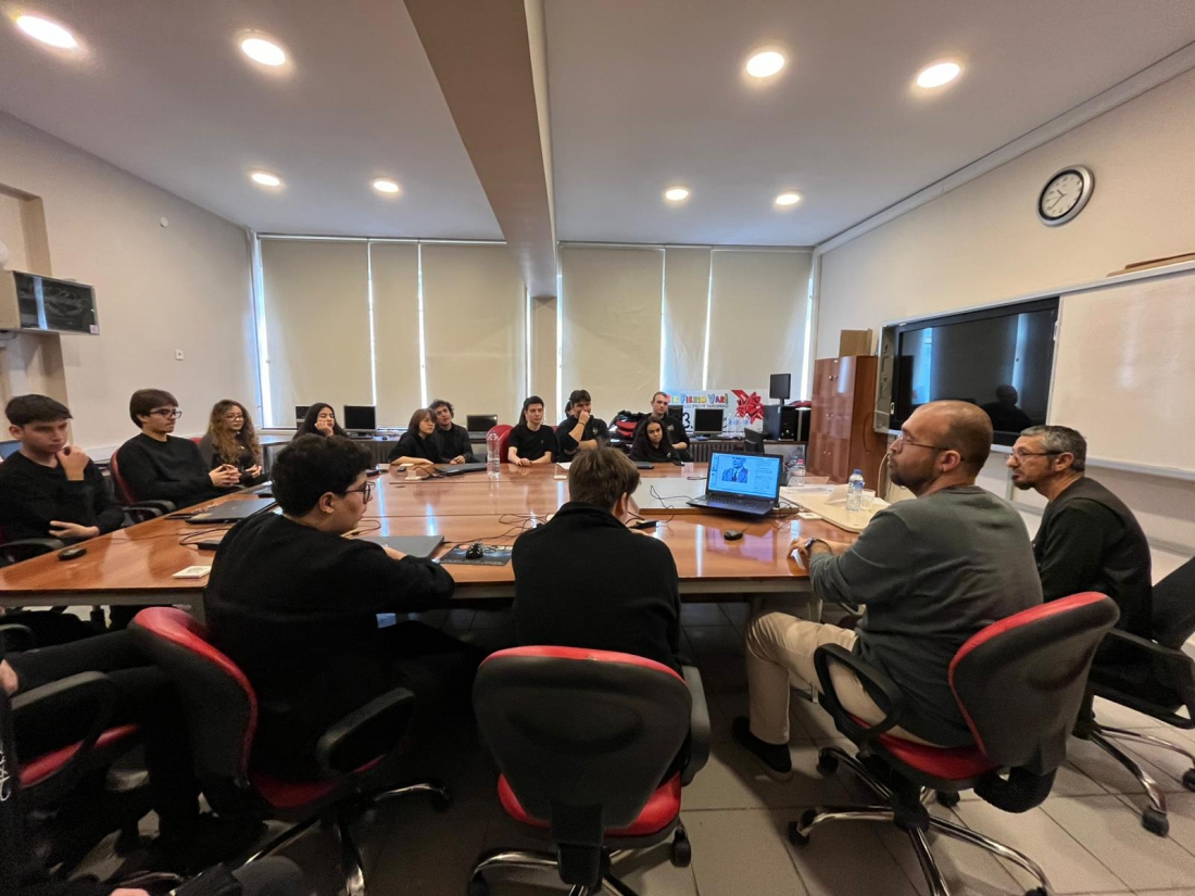 Doç. Dr. Talha Burak Alakuş ise öğrencilerle yuvarlak masa formatında bir araya gelerek "Yapay Zeka ve Felsefe" konusunu işledi. Bu oturumda, gelişen teknolojilerin etik boyutu, insan-makine etkileşimi ve geleceğin mühendislik vizyonu felsefi bir zeminde değerlendirildi.